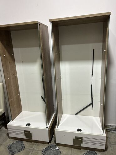 İki əd tək bölməli vitrin şkaf - Stil: klassik/neo-klassik, krem rəngli korpus, dekorativ frezeli çərçivələr - Material: MDF/taxta karkas, şüşə qapılar və şüşə rəflər - Quruluş: 2 ayrı şkaf yan‑ya...