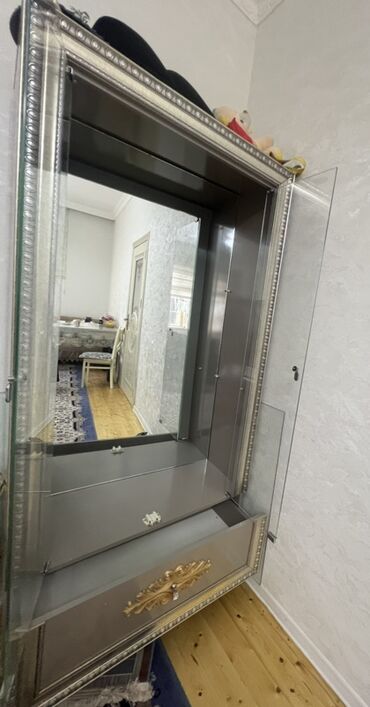 təzə kimidir - Material: MDF əsaslı korpus, şüşə vitrin qapıları - Rəng: krem/ivori tonları, qızılı dekorativ işləmələr və haşiyələr - Qapılar: 2 ədəd şüşəli qapı, zərif metal tutacaqlar - Daxili...