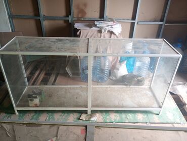 Şüşə vitrin/qablaşdırma stendi - Material: möhkəm alüminium karkas və şəffaf temperli şüşə panellər - Rəng: ağ çərçivə - Üst hissə tam şüşə, yan və ön hissələr şüşə panellidir - Ön tərəfdə sürüşən...
