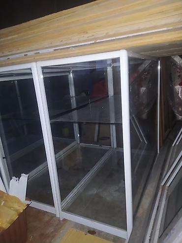 Şüşə vitrin stend - Material: tam şüşə korpus, metal (ağ) profilli çərçivə və kənarlarda metal künc qoruyucuları - Ön tərəf: şüşə sürgülü/çevrilən qapı (əlcikli), vitrinə rahat giriş - Rəflər: 1 ə...