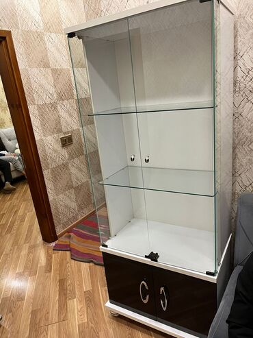 Şüşəli vitrin dolabı - Material: ön hissə temperli şüşə sürgülü qapılar, “push” mexanizmi ilə açılıb-bağlanır; gövdə ağ-qara rəngdə taxta/laminat. - Daxili quruluş: 3 səviyyə şüşə rəf; geniş nümay...