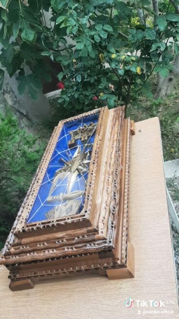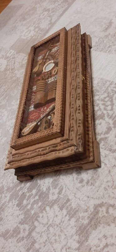 Taxta əl işı sandıq/qutu - Material: tam ağac gövdə, əl oyma naxışlarla bəzədilmiş kənarlar - İçlik: qırmızı məxməri/parça örtük, qara-ağ bükülü kordonla işlənmiş haşiyə - Qapaq: daxili güzgü (ürə...