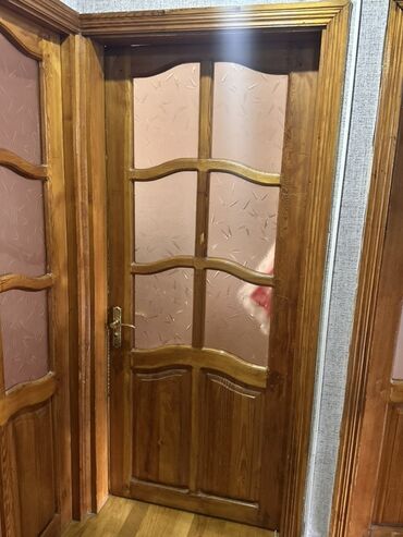 Taxta qapı – şüşəli dizayn - Material: bərk ağac (təbii naxışlı), laklı səth - Rəng: açıq-qəhvəyi/şam tonları - Konstruksiya: üst hissədə mat (donuq) şüşəli dekorativ pəncərələr, ortada və aşağıda...
