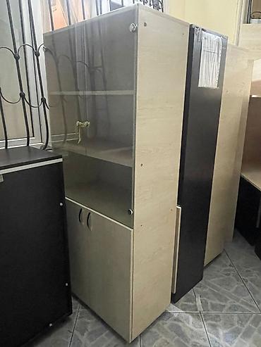 Vitrin şkaf - Material: ağac dekorlu laminat korpus, açıq rəngli. - Ölçü təxmini: hündürlük ~190–200 sm, en ~60–70 sm, dərinlik ~35–40 sm. - Daxili quruluş: 2 ədəd qalın şüşə rəf + alt hissədə gen...