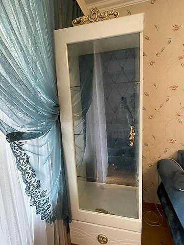 Şüşə vitrin dolabı 2 ədədi biri 200 azn endirim olunacaq - Klassik tərzdə dizayn: krem-ağ korpus, qızılı sütunlar və dekor detalları - Ön hissə tam şüşə sürgülü qapılarla; daxilində 3 şüşə rəf (ümu...