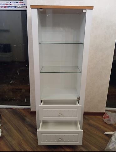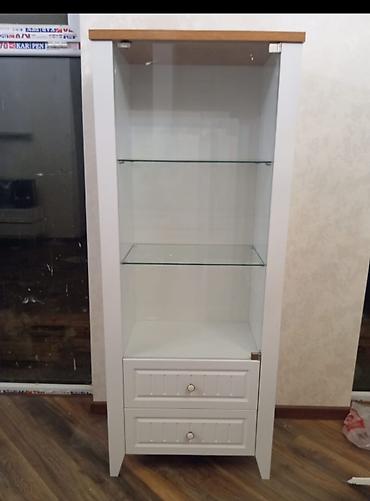 - Material: Korpus – laminat/MDF görünüşlü ağ səth; vitrin hissəsi şəffaf şüşə; yuxarı örtük taxta rənglidir.