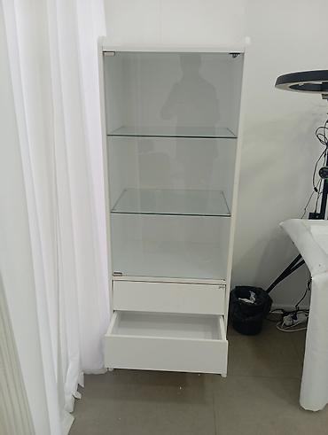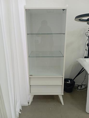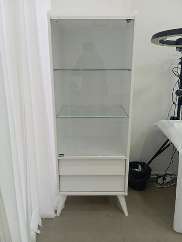 Ağ rəngli vitrin şkaf - Dizayn: Üst hissədə ağac tonunda dekorativ üstlük, ön hissədə şüşə vitrin bölməsi və aşağıda iki çekmece. - Raflar: 2 ədəd möhkəm şüşə raf – dekor, qab-qacaq, kolleksiya əş...