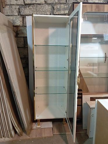 Ağ rəngli vitrin şkaf - Dizayn: Üst hissədə ağac tonunda dekorativ üstlük, ön hissədə şüşə vitrin bölməsi və aşağıda iki çekmece. - Raflar: 2 ədəd möhkəm şüşə raf – dekor, qab-qacaq, kolleksiya əş...