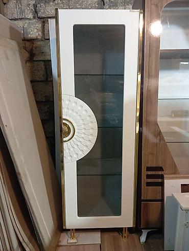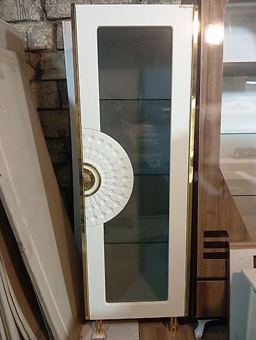 Türkiyə istehsalı vitrin/dolap - Material: ağac teksturalı laminat korpus, ön və yan hissələrdə temperli şüşə - Dizayn: lazer naxışlı dekor panellər, qapalı şüşə vitrin bölməsi - Rəng: tünd qoz ağ...