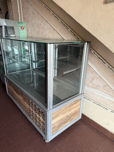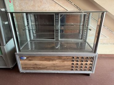 Qeyd: Şəkildə görülən qurğu elektriklə işləyən soyuducu vitrindir; şüşə rəflər və yuxarı şüşə masa səthi ilə məhsulların səliqəli sərgilənməsini təmin edir.