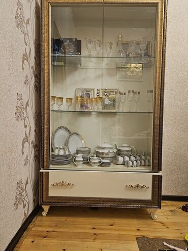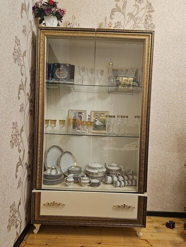 Klassik üslubda vitrin şkaf dəsti - Rəng: krem-bej korpus, üst hissədə qızılı barokko naxışlı dekor. - Material: laminat/MDFlam korpus, ön tərəf şüşə qapılar; iç bölmələrdə qalın şüşə rəflər. - Hü...