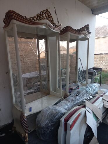 İki əd tək bölməli vitrin şkaf - Stil: klassik/neo-klassik, krem rəngli korpus, dekorativ frezeli çərçivələr - Material: MDF/taxta karkas, şüşə qapılar və şüşə rəflər - Quruluş: 2 ayrı şkaf yan‑ya...