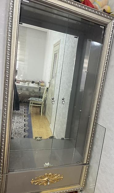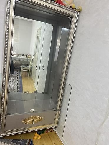 Təxmini ölçülər (şəkillərə əsasən): hündürlük təqribən 2 m, en 1 m civarı. Rəng: gümüşü çərçivə, qızılı ornament, şəffaf şüşə.