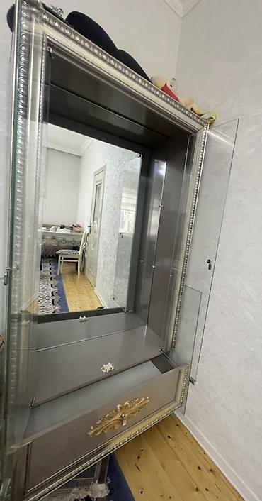 Şüşə vitrin şkaf - Klassik dizaynlı, gümüşü tonlarda çərçivə və dekorativ qızılı ornament. - Ön hissə tam şüşə vitrin: iki ədəd şüşə qapı, kristalvari tutacaqlar. - İç hissə güzgülü arxa fon – eks...