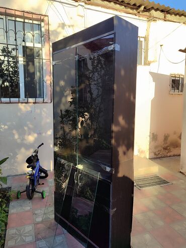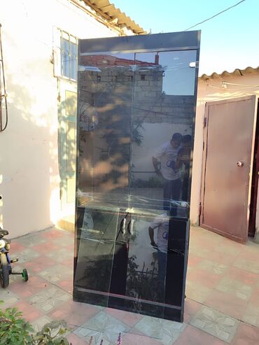 - Material: ağac karkas + qara parlaq MDF/laminat önlər, şəffaf şüşə vitrin qapıları