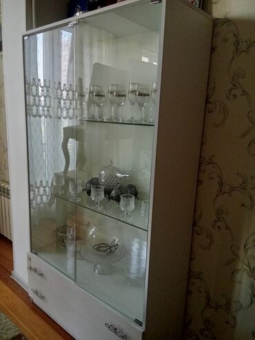 - Material: MDP/taxta korpus, temperli şüşə qapı və rəflər