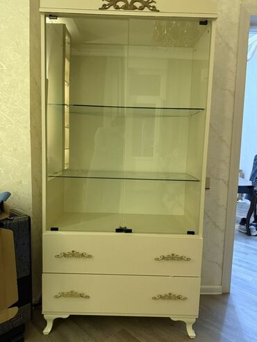 - Material: MDF/kombinə korpus, ön tərəflər parlaq krem örtük, vitrin hissə tam şüşə