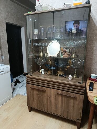 - Material: ağac fakturalı korpus, ön tərəfi şüşə vitrin