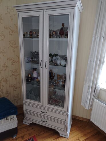 Klassik üslubda vitrin/dolap təzədi 2 ədəd var - Rəng: krem-ağ, qızılı dekor elementləri ilə - Material: MDF/taxta karkas, şüşə vitrin qapıları - Dizayn: üst hissədə oymalı qızılı tac, ön hissədə ...