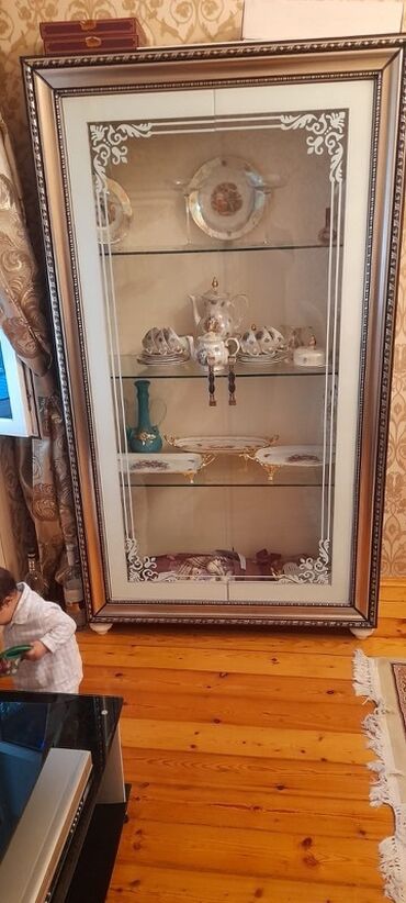 - Şüşəli vitrin: 1 ədəd. Ön hissəsi naxışlı dekorlu şüşə ilə, içəridə 3 səviyyəli şüşə rəf; qab-qacaq, suvenir və kolleksiya üçün geniş sərgiləmə sahəsi. Korpusda bərq vuran gümüşü-qızılı çərçivə elementləri, aşağıda dayanıqlı balaca ayaqlar.