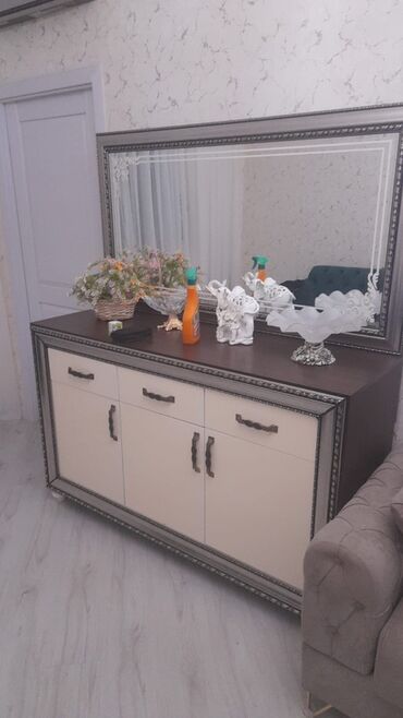 - Bufet-komod və böyük güzgü: Üst hissə tünd ağac tonunda masa səthi, aşağıda 4 qapılı geniş dolab bölməsi; metallik tutacaqlar. Üstündə ölçülü, çərçivəsi dekorativ naxışlı iri güzgü.