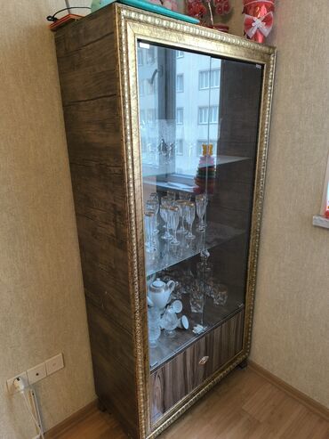 Şüşə vitrini – klassik dizaynlı bufet - Material: ön hissə temperli şüşə, korpus ağac/laminat, dekorativ çərçivə ilə. - Rəng: qəhvəyi korpus, bəzəkli qızılı-bej çərçivə. - Quruluş: - 3 mərtəbəl...