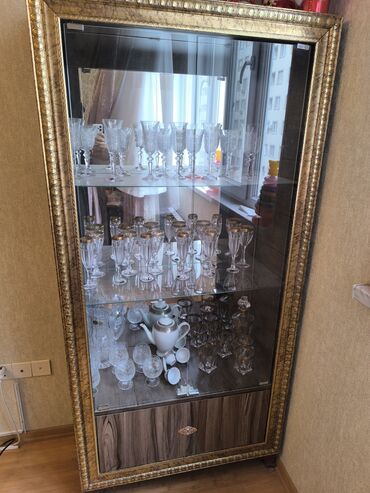 Vitrin şkaf dəsti – klassik dizayn - Material: ağac əsaslı korpus, ön hissədə şüşə qapılar; tünd qəhvəyi çərçivə üzərində qızılı dekorativ haşiyə - Rəf sistemi: içəridə bir neçə şüşə rəf, qab-qaca...