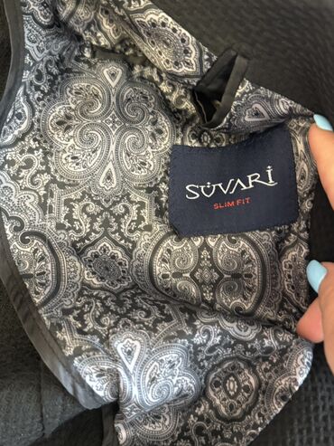 Kişi kostyumu – iki parçalı - Rəng: tünd boz, incə xətli (micro-check/çizgili) naxış - Model: 2 düyməli klassik pencək, dar krujevalı (notch) yaxa - Pencəkdə: sinə cibinin üstü (bilet cibi görünüş...