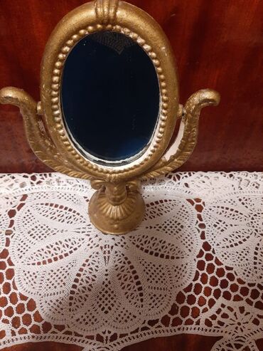 MasaüstüSuvenir Güzgü.Ev malıdır.Çox gözel formadadır Bəzəklidir.Stolustu qoymaq olar Fiqurni ayağı var Möhkəm materiyaldandir.Qədimi maldir.