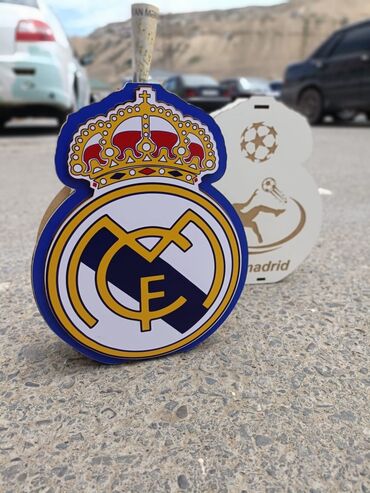 Real Madrid futbol klubunun loqosu təsvir olunmuş suvenir. Ağ fonda