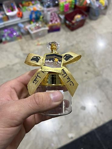 - Şüşə ətir qabı: Yuxarısı kristalvari başlıqla bəzədilmiş, qapağında qızılı lent və Kəbə motivli emblemlə dekor. Şəffaf şüşə gövdə, içlik əlavə etmək üçün vintli başlıq. Stolüstü bəzək və ya yağ/ətir üçün qab kimi uyğundur.