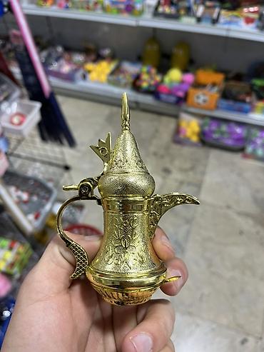 - Miniatür ərəb qəhvə cezvəsi (dallah): Metal materialdan, qızılı rəng, relyef naxışlar, dekorativ qapaq və dəstək. Şərq temalı kolleksiyalar və interyer bəzəyi üçün.