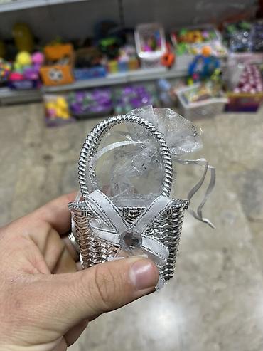 - Gümüşü səbət suveniri: Metal hörgü görünüşlü gövdə, üzərində ağ lent və şəffaf bəzək daşı. İçində orqanza kisə yerləşdirilib – xırda hədiyyə və ya şirniyyat qoymaq üçün dekorativ qab.