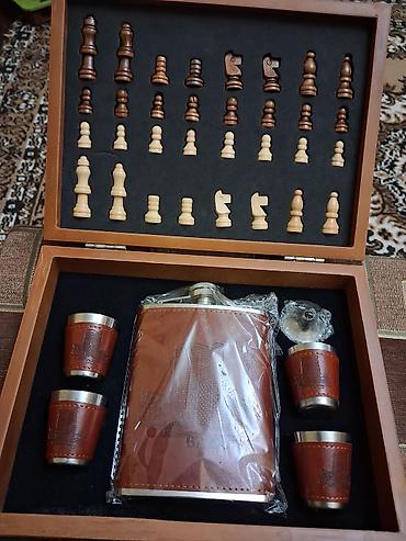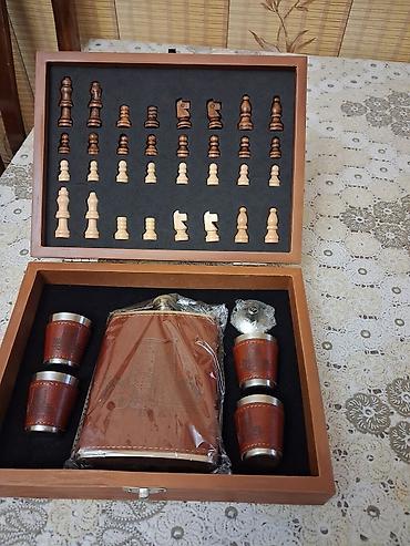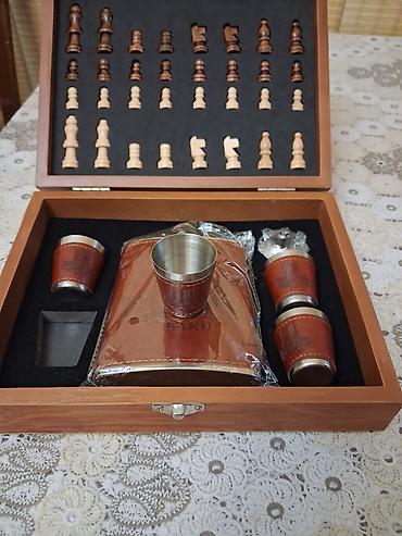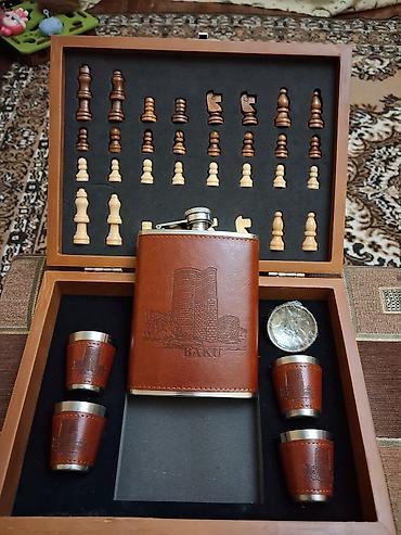 “Azerbaijan Souvenir” taxta dəst – şahmat və viski/flask aksessuarları bir yerdə.