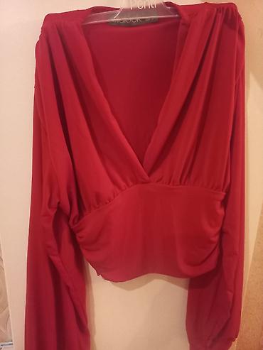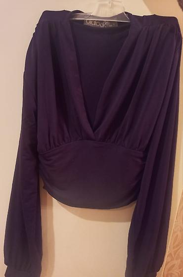 1) Bluz – V yaxalı, büzgülü kəsim, uzun qol, qısa/kropped model. İki rəngdə: tünd bənövşəyi və qırmızı. Yumşaq, axıcı parça, sinə hissəsi və bel xətti büzməli. (etiketdə S ölçü qeyd olunur).