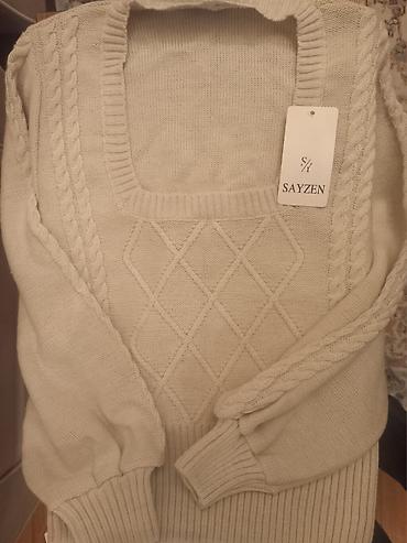 2) Sviter – qaymaq/açıq bej rəngdə trikotaj. Kvadrat yaxalı, ön hissədə romb naxışı, qollarda hörmə detalları. Elastik manjet və bel hissəsi. təxmini ölçü S/M.