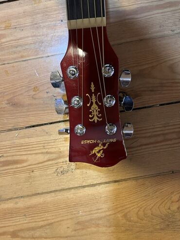 - Qulp (headstock): qırmızı-qızılı “Swift Horse” loqosu və ornament, 3+3 xrom mexaniki kulaklar.
