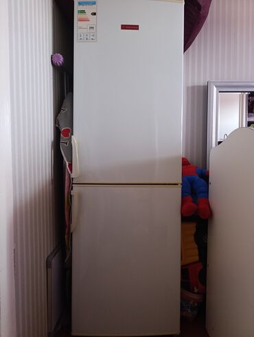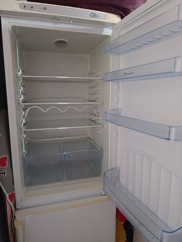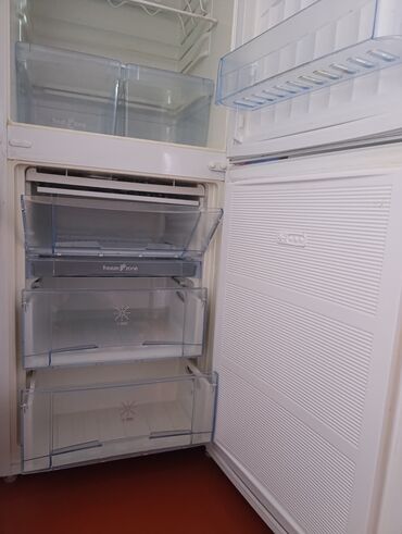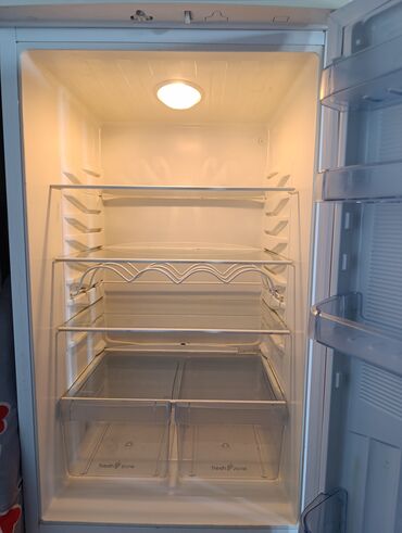 - Üst hissə: soyuducu kamera, tənzimlənən 3 şüşə rəf, ayrı meyvə‑tərəvəz bölməsi (iki şəffaf qutu), qapıda 4 ədəd geniş rəf. Daxildə butulka üçün metal saxlayıcı.