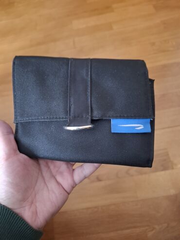 - Qatlanan, qara rəngli parça kosmetik/aksesuar çantası, maqnitli qapanma və metal detalla.