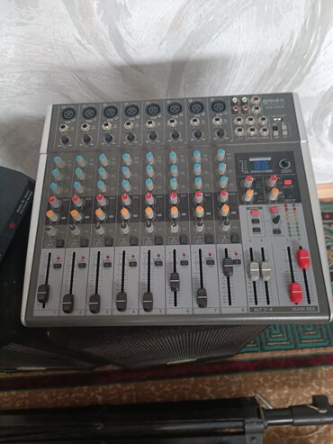 - 1 ədəd qarışdırıcı pult (8 kanal: mikrofon və xətt girişləri, qazanclar, EQ və faderlər, master səviyyə nəzarəti; AUX/FX və tape əlaqələri görünür)