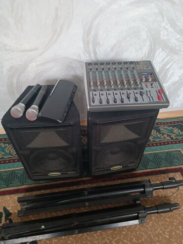 Komplekt fotoşəkillərdə görüldüyü kimidir: iki kolon, mikser, iki simsiz mikrofon + qəbuledici və iki ədəd tripod dayağı. Plug-and-play səyyar PA həlli kimi ideal paketdir.