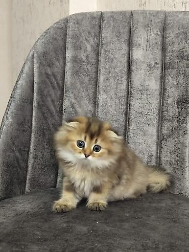 Britan Şotland qıvrıqqulaq (Scottish Fold) bala pişik - Rəng: bərk krem/boz (solid), tükü qalın və yumşaq - Qulaqlar qıvrıq, başı iri və yumru, geniş yanaqlar - Gözlər böyük və ifadəli - Anadangəl...