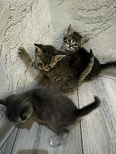 Sevimli balaca pişiklər – bir bala dəsti - Cins: ev pişiyi (domestik qısa tüklü) - Say: 3 bala - Rənglər: - Boz-ağ (tünd boz zolaqlı) - Ağ–qara ləkəli - Tünd təkəlduz (tiger/zolaqlı) - Təxmini y...