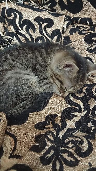Zolaqlı boz balaca pişik balası - Cins: yerli (zolaqlı/“tabby” rəng çaları) - Rəng: boz-qara zolaqlı, qarın tərəfi daha açıq - Qulaqlar iri, gözləri badamı, quyruğu qısa və tüklü - Kiçik ölçülü, y...