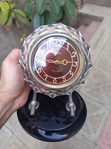 - Ölçü (təxmini, fotolara əsasən): saat hissəsi ~9–10 sm diametr, ümumi hündürlük ~13–15 sm