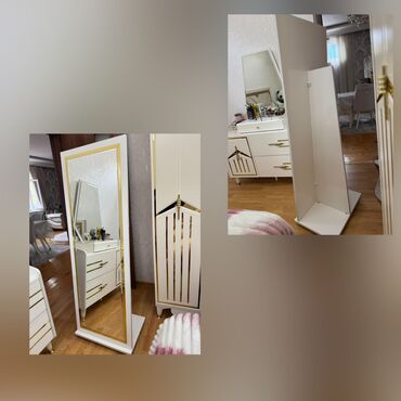 - Materiallar: MDF/taxta korpus, qızılı tonlu metal/plastik haşiyə, parlaq güzgü şüşəsi.