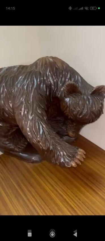 Xüsusiyyətləri ilə diqqət çəkən, təbii ağacın isti tonu və əllə oyulan fakturası olan dekorativ ayı heykəli.