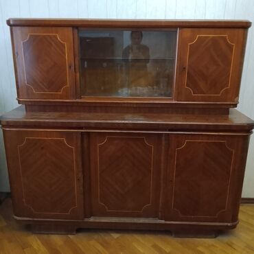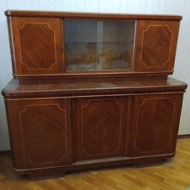 - Yuxarı hissə: ortada şüşə vitrini (sürüşən şüşə qapılar), hər iki tərəfdə taxta qapılı bölmələr