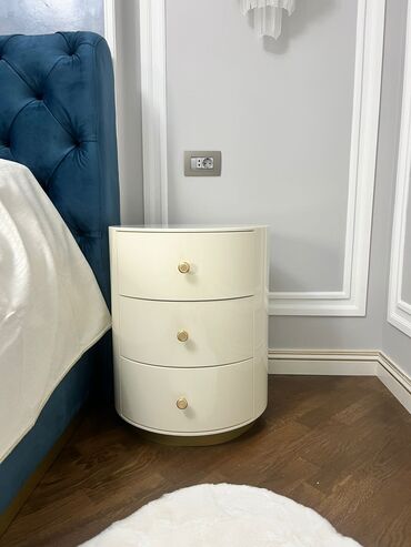 - Oval bedside tumbə: krem rəngli, parlaq (piano) örtüklü korpus, üç ədəd dairəvi qızılı tutacaqlı siyirmə; alt hissədə dekorativ qızılı baza. Yumru kənarlar və səliqəli xətlər yataq otağı interyerinə modern və zərif görünüş qatır. Siyirmələr gündəlik əşyaların (aksessuar, kitab, kosmetika və s.) yığcam saxlanması üçün əlverişlidir.