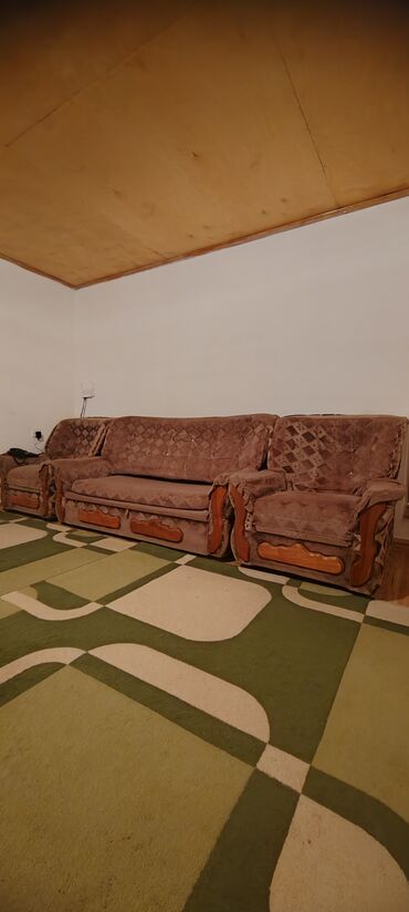 Üç hissədən ibarət bu divan dəsti qəhvəyi rəngdədir və naxışlı parçadan hazırlanıb. Dəstə iki təkli kreslo və bir üçlük divan daxildir. Divan açılıb yataq halına gətirilə bilər, bu da onu qonaqlar üçün əlavə yatacaq yeri kimi istifadə etmək üçün əlverişli edir. Kresloların və divanın qoltuqaltıları taxta detallarla bəzədilib, bu da dəstə klassik görünüş verir. Bu dəst qonaq otağı və ya istirahət otağı üçün uyğundur.